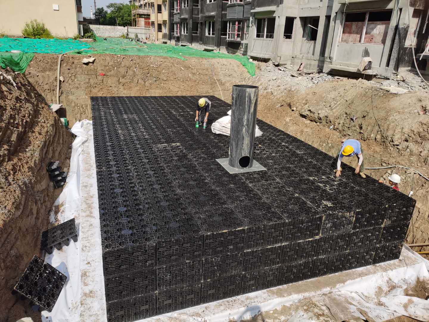 該項(xiàng)目雨水回收系統(tǒng)采用地埋PP模塊組合水池的方式收集雨水,前期經(jīng)過(guò)截污掛籃、棄流過(guò)濾,后期通過(guò)地埋一體機(jī)過(guò)濾,消毒,最終使水質(zhì)達(dá)到規(guī)范標(biāo)準(zhǔn),用于廠區(qū)綠地的澆灑,景觀補(bǔ)水,道路沖洗。